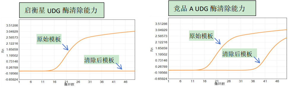 UDG酶清除含有尿嘧啶碱基的DNA模板的结果。使用含有尿嘧啶碱基的DNA模板作为原始模板,不加入UDG酶作为对照,分别加入不同品牌的UDG酶对原始模板进行清除,扩增结果显示,启衡星UDG酶能够彻底清除使用dUTP体系的PCR产物。