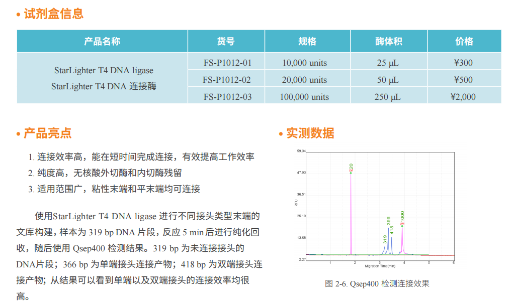 StarLighter T4 DNA ligase 是一种高特异性的核苷酸连接酶,专一催化 DNA 片段间磷酸二酯键形成,高效连接平末端、粘性末端及单链缺口。其核心功能为促进 DNA 断裂修复、无缝克隆及重组质粒构建,广泛应用于基因编辑、CRISPR 载体制备、文库构建及长片段组装。